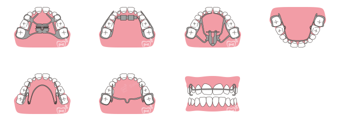 装置は、短いもので半年くらい、長いもので1~2年使用します。あごの発育や乳歯から永久歯への生えかわりの際に必要に応じて使用装置を作りかえ、治療を進めていきます。